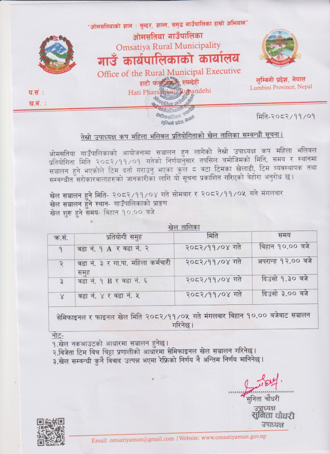 तेस्रो उपाध्यक्ष कप महिला भलिवल प्रतियोगिताको खेल तालिका सम्वन्धि सूचना !