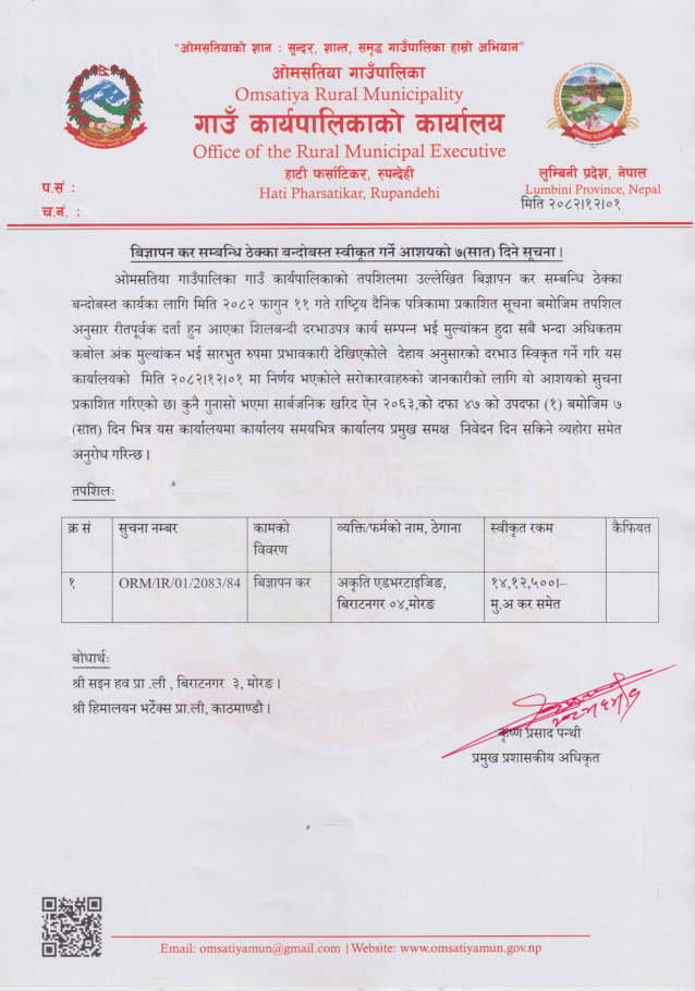 विज्ञापन कर सम्वन्धी बोलपत्र स्वीकृत गर्ने आसयको ७ दिने सूचना !
