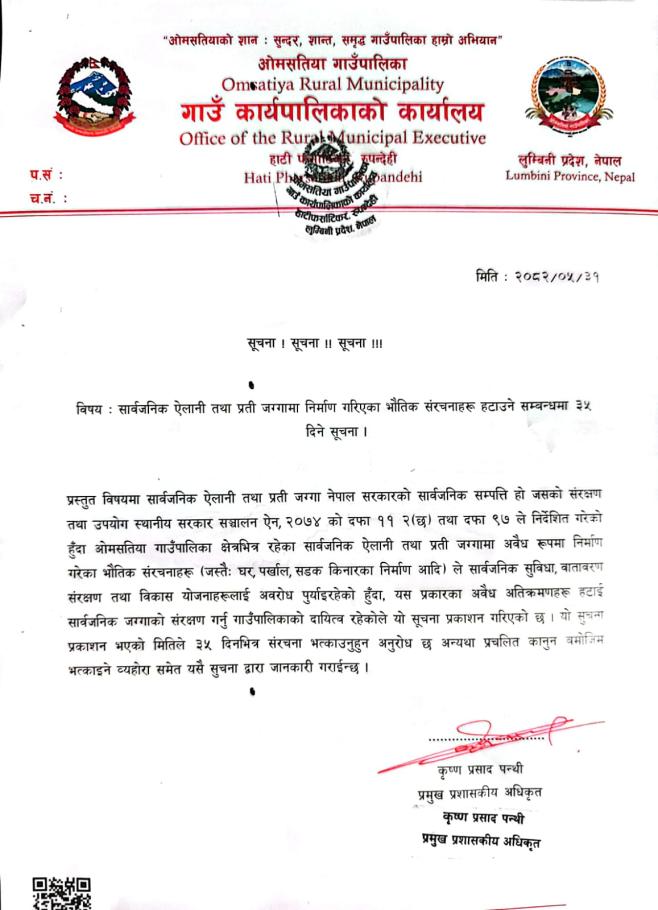 सार्वजनिक एलानी तथा प्रति जग्गामा निर्माण गरिएको भौतिक संरचनाहरु हटाउने सम्बन्धमा ३५ दिने सूचना