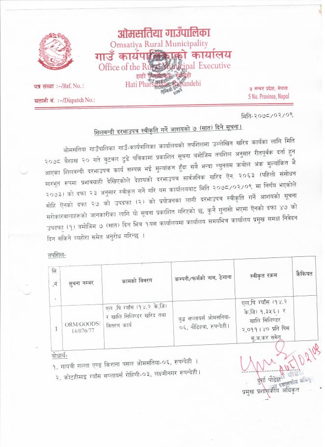 सुचना न. ORM/GOODS/14/076/77 को सिलबन्दी दरभाउ पत्र स्वीकृति गर्ने आशयको ७ (सात) दिने सुचना