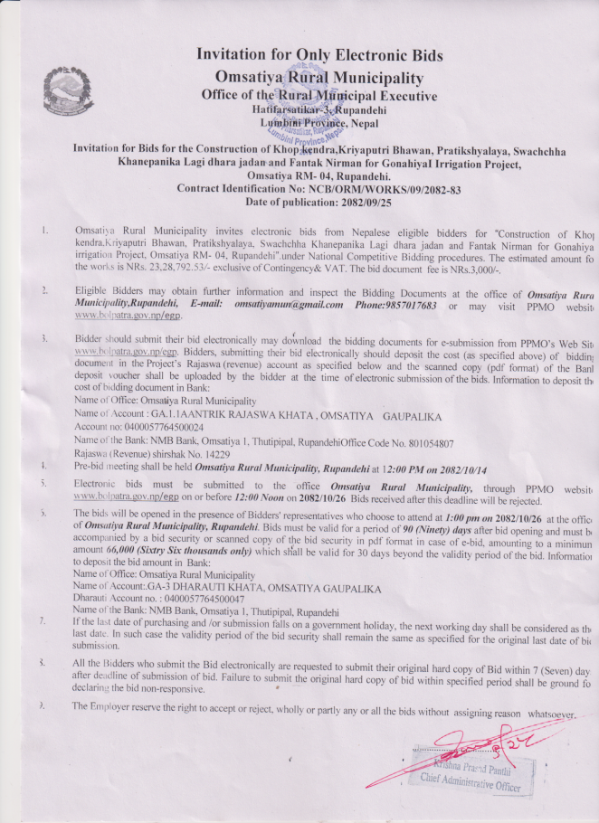 Invitaton for Bids. Identification No. NCB/ORM/WORKD09/2082-83