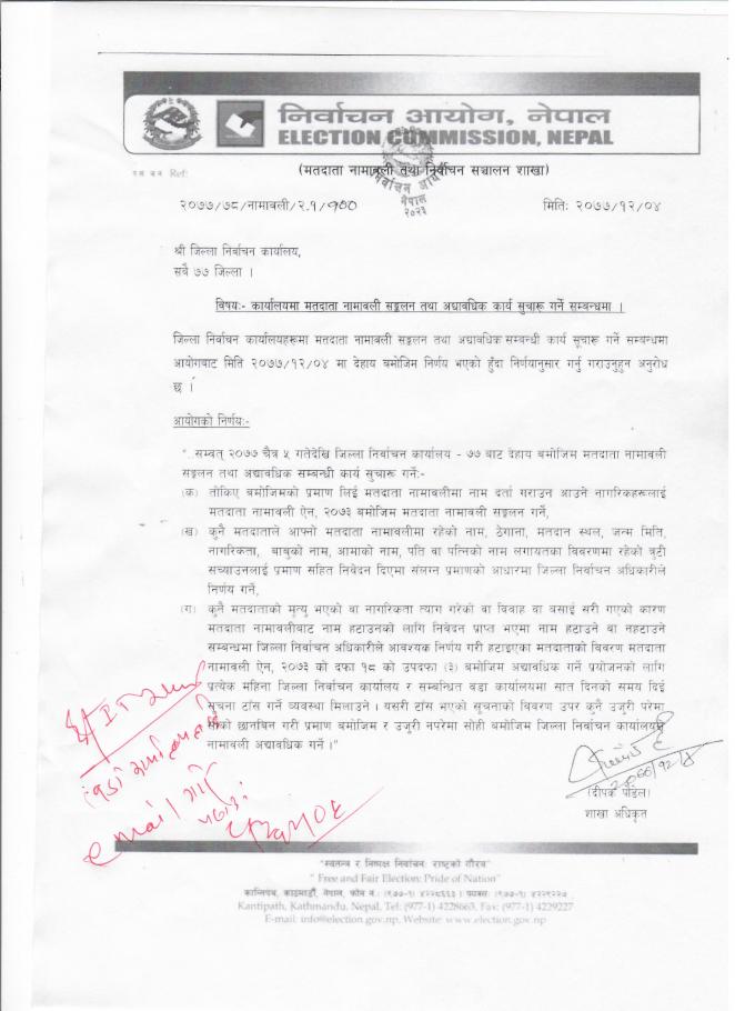 मतदाता नामावली सङ्कलन तथा अध्यावधिक कार्य सुचारु गर्ने सम्बन्धमा