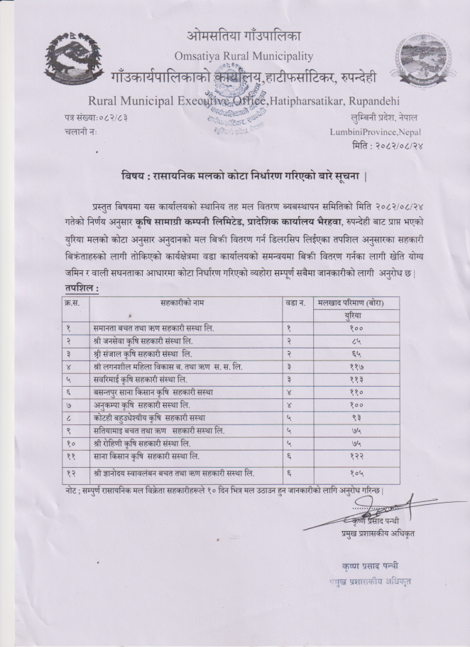 युरियामलको कोटा निर्धारण गरिएको सूचना !