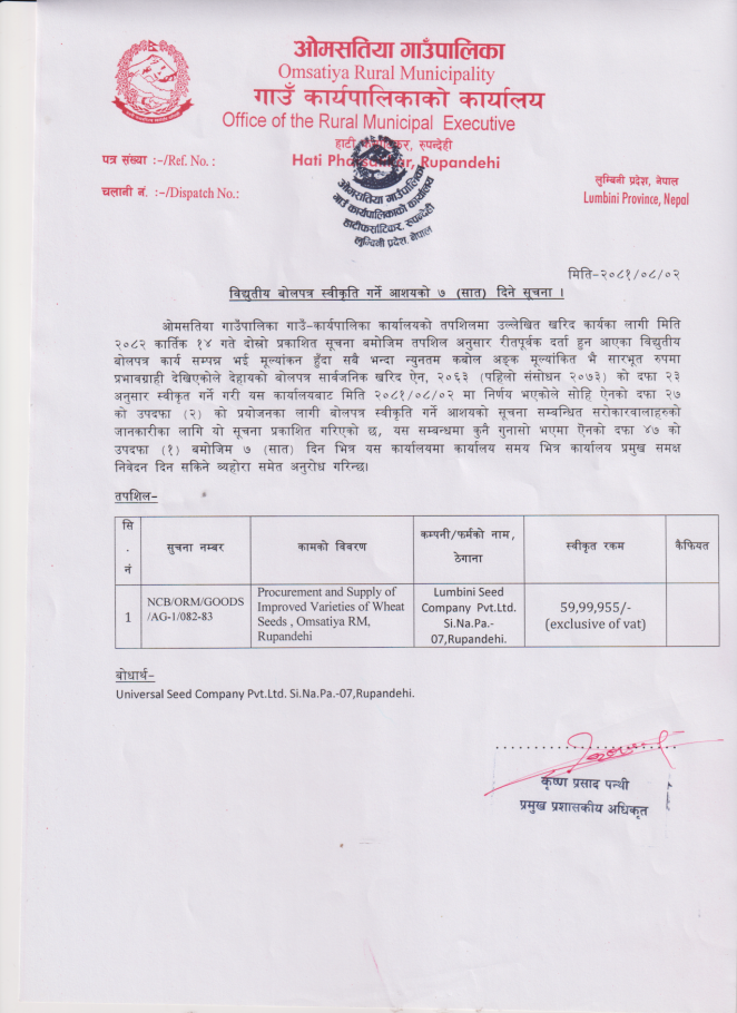 विद्धुतिय बोलपत्र स्वीकृत गर्ने आसयको ७ दिने सूचना !