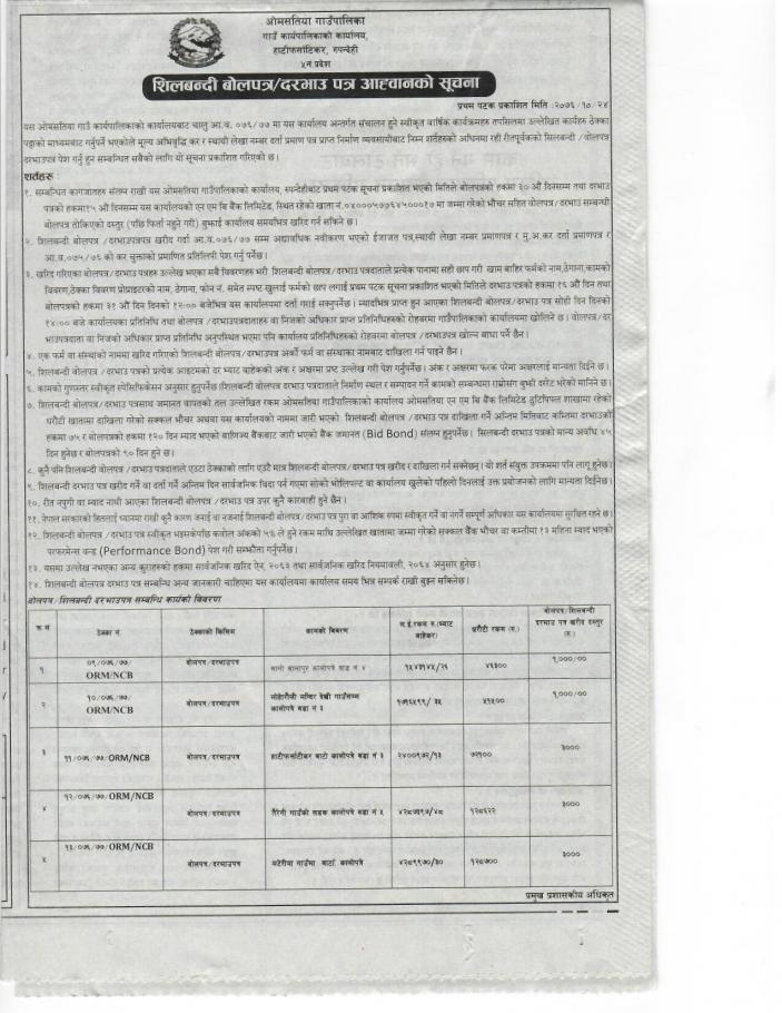 शिलबन्दी बोलपत्र/दरभाउ पत्रको आह्वानको सुचना