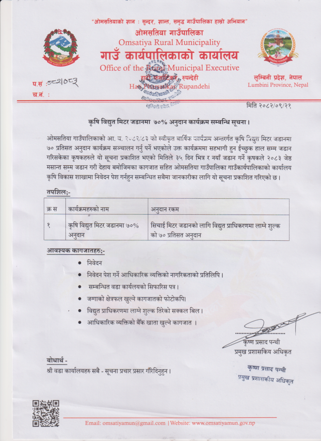 » ७०% अनुदानमा कृषि मिटर जडान सम्वन्धी सूचना !