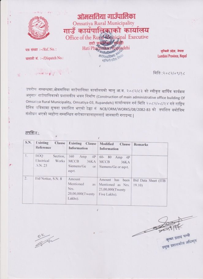 NCB/ORM/WORK/08/2082-083 को BOQ शंसोधन सम्वन्धि सूचना !
